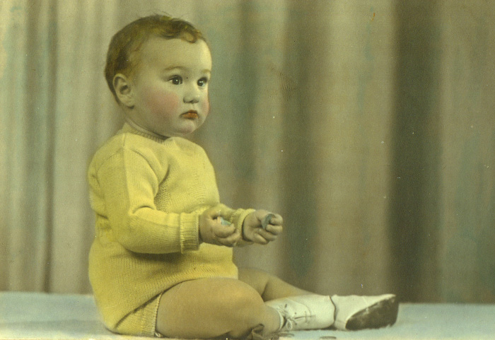 "Mum and Dad told me that the only way to pacify me at this age was to give me two half-crowns to play with and here I am clutching them. Better than feeding me chocolate I suppose."