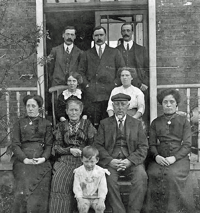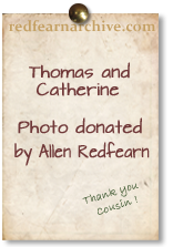 Catherine and Thomas are seated front and centre in this photograph taken after 1911. On their left and right and directly behind Thomas are their daughters Edith Ann, Catherine Emma and Jessie but it is uncertain which is which.The young lad is probably Duncan Macdougal born in 1908, the son of Catherine Emma.The young woman wearing a white collar (without the distinctive Redfearn chin so prominent on the sisters) is thought to be Gertrude Evans, wife of Walter Thomas Redfearn.At the back are three of their four sons : George Robert (probably centre), Alfred (probably right) and Walter Thomas. Frederick William had emigrated to Australia in 1911.