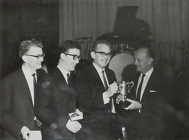"My brother Ian is on the left, then comes Derek Tucker (my best man) and the trophy is being presented to me by Victor Barna five times World Champion."